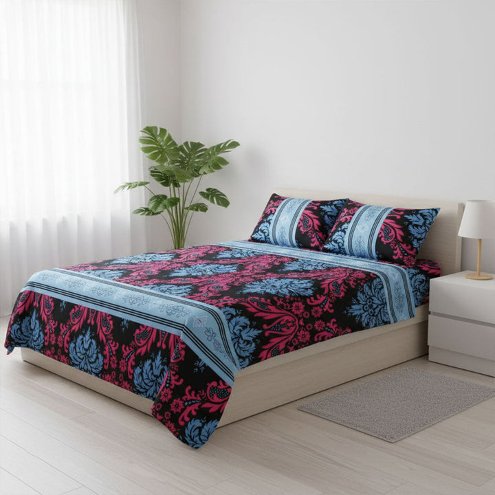 To give a vibrant and attractive look to your bedroom. This beautiful Polycotton bedsheet is designed using eye-catching colour patterns and alluring designs.