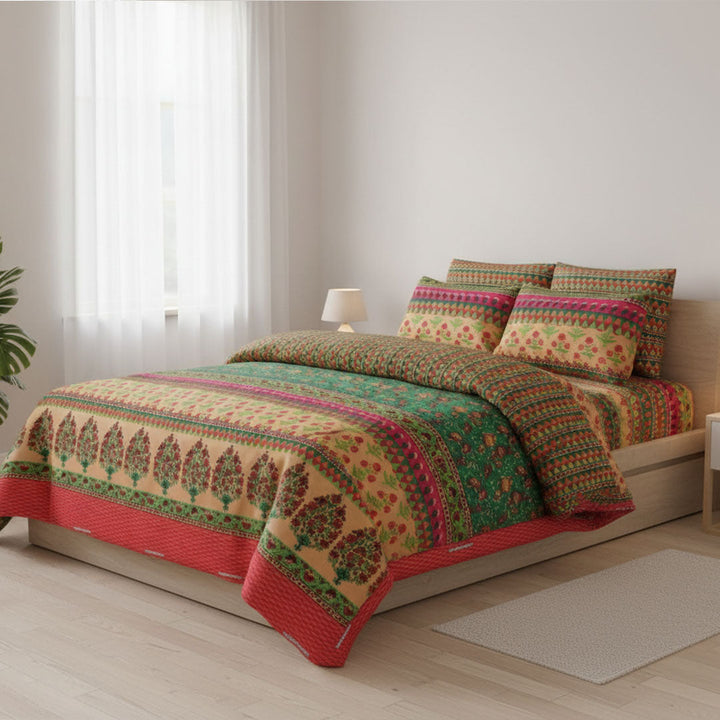 To give a vibrant and attractive look to your bedroom. This beautiful Polycotton bedsheet is designed using eye-catching colour patterns and alluring designs.